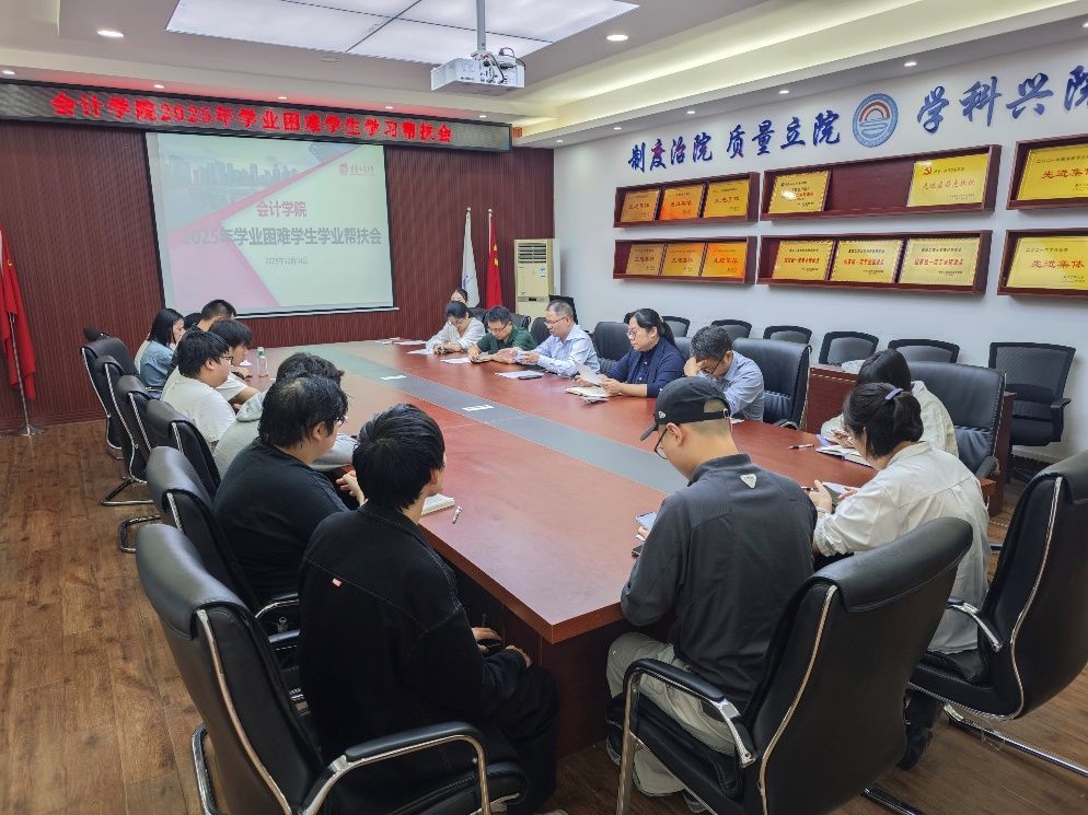 为深入推进学风建设,精准帮扶学业困难学生,会计学院于2025年10月14日中午在明德楼2019会议室隆重召开2025年学业困难学生学业帮扶会。学院党委副书记郝颖、副院长梅波、财务系主任王世杰、国际教育中心主任宋昕倍、会计系主任蒋弘、相关学生辅导员及8名学业困难学生共同参会。