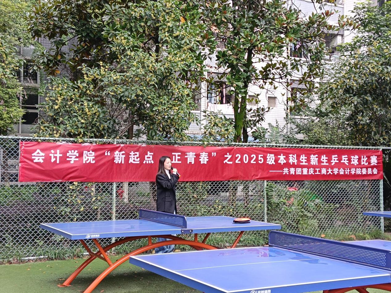 10月26日上午,重庆工商大学会计学院“新起点·正青春”2025级新生乒乓球比赛在兰花湖校区室外乒乓球场地成功举办。此次比赛由共青团重庆工商大学委员会主办、会计学院分团委学生会与搏燃体育协会联合承办,共26名选手参与此次比赛及多名学生观众共同参与活动。乒乓球比赛启动前,会计学院李芋蓉老师为选手们做动员,让大家以训练时的状态投入赛场,自信发挥。