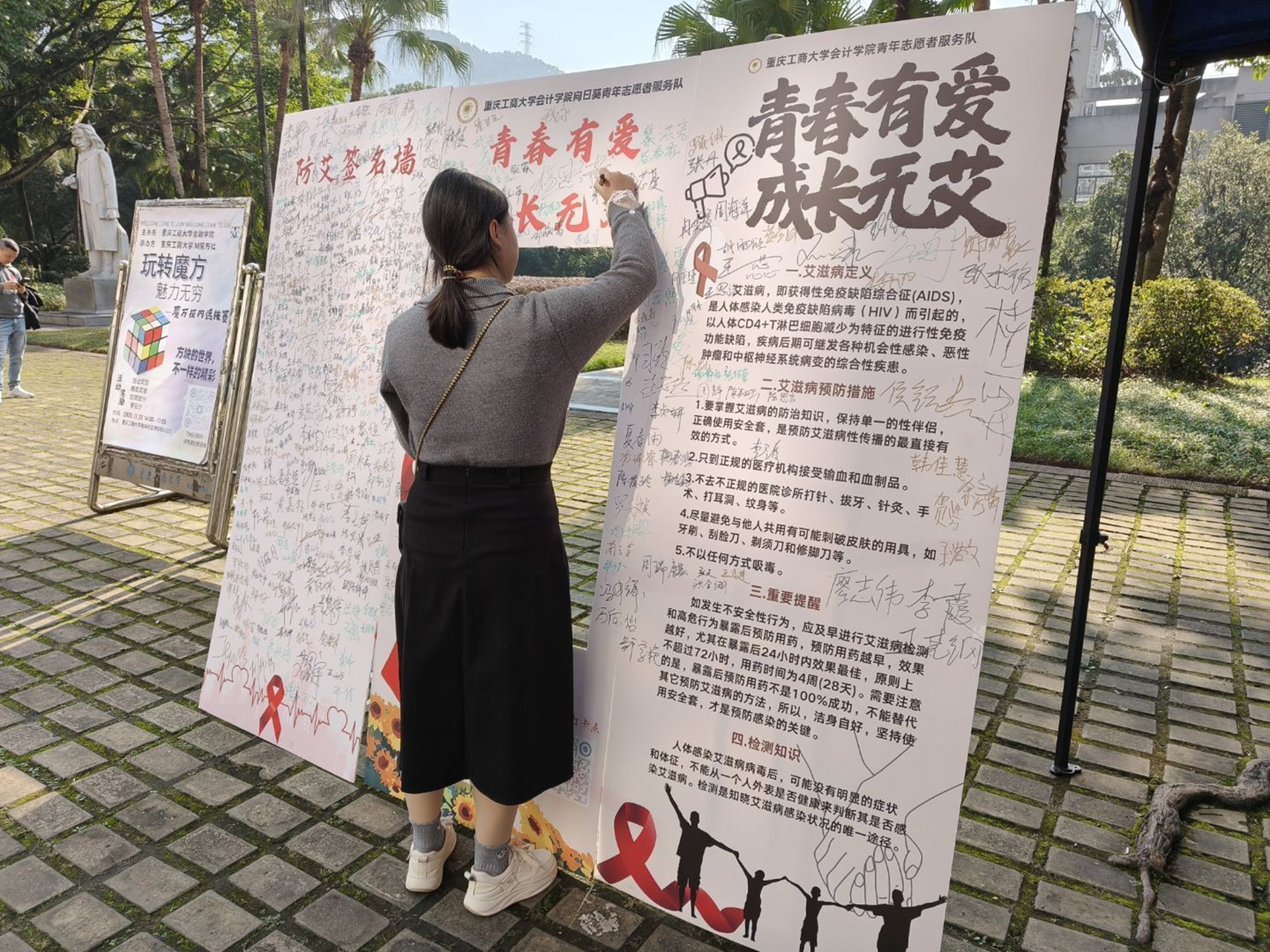 为筑牢校园健康防线,普及艾滋病防治知识,消除对艾滋病患者的歧视与误解,重庆工商大学会计学院向日葵青年志愿者服务队于2025年11月20日至21日,在南岸校区博智楼前成功举办重庆工商大学第十八届“红岩铸魂,筑梦启航”志愿文化节“防艾筑健康,献血暖校园”防艾献血系列活动——“青春有爱,成长无艾”防艾宣传活动。