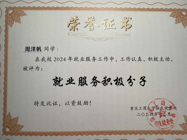周洋帆深耕学业、笃行不怠,成绩始终名列前茅,连续两年班级综测第一,学年绩点达4.09,凭借优异表现斩获本科生国家奖学金、优秀学生综合奖学金、学习优秀奖学金,同时获评校级优秀学生、优秀团员、学习标兵等荣誉,成为学业领域的标杆。在学科竞赛中,她主动突破、敢闯敢拼,先后拿下2025年全国企业竞争模拟大赛全国二等奖、2025年贺岁杯企业经营分析与决策大赛全国三等奖等国家级奖项,以及2025年全国大学生统计建模大赛重庆市二等奖、2025年商科创新能力大赛重庆市三等奖等省部级奖项,此外积极参与学术、体育、美育类竞赛,均收获校级以上奖励,以多元能力诠释全面发展。