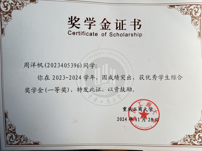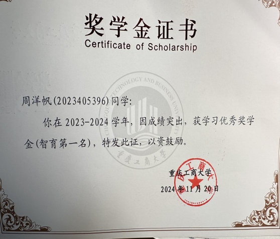 编者按:以笃学筑基,以奋进逐光,会计学子在求知路上步履不停,终能绽放耀眼光芒。周洋帆,重庆工商大学会计学院23财务一班优秀学子,凭借扎实的学业功底、亮眼的竞赛成绩与热忱的责任担当,斩获国家奖学金,成为学院学子争相学习的榜样,其成长轨迹尽显青春奋斗本色。