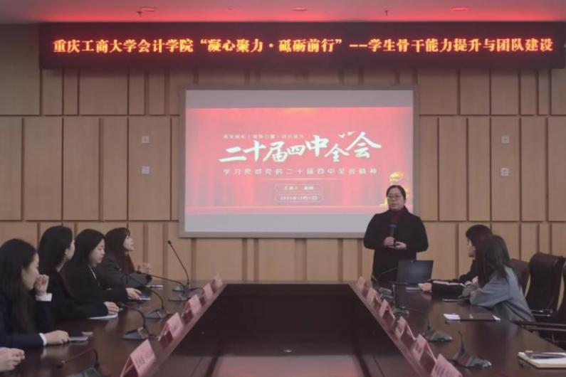 2025年12月11日下午,会计学院党委副书记郝颖在图书馆第五会议室开展了二十届四中全会主题宣讲,面向学院60余名学生骨干解读全会精神。她紧扣高质量发展与新质生产力的核心要义,结合“五育并举”育人导向,系统阐释全会精神对高校学生工作提出的实践要求。郝颖书记既从理论层面剖析全会精神的核心逻辑,又从实践角度指导学生骨干如何将全会精神融入学风建设、活动组织等具体工作。学院后续还将通过思政课堂、座谈会等形式持续深化宣讲,让理论解读既有高度又有温度,为学生骨干筑牢思想根基。