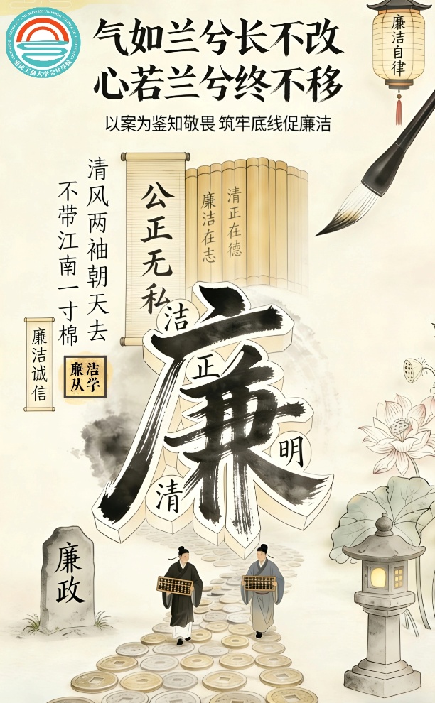 为营造风清气正的校园环境,深化清廉学院建设,2026年3月2日至3月7日,会计学院举办了“崇廉尚洁,艺润初心”海报设计大赛。本次大赛紧扣会计专业“诚信为本、操守为重”的核心素养,将廉洁理念与视觉创意深度融合,吸引了全院学子积极参与,以画笔为媒传递清风正气。