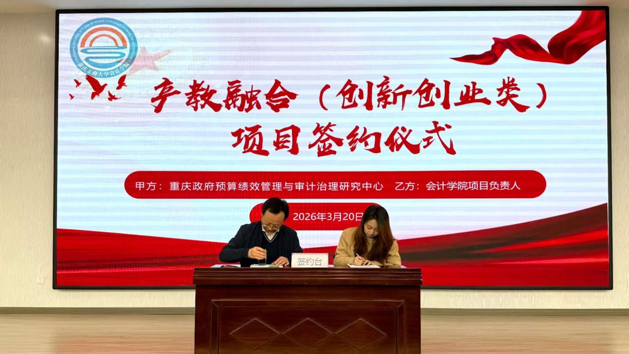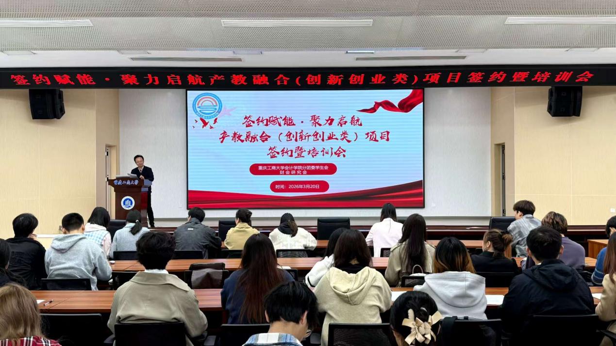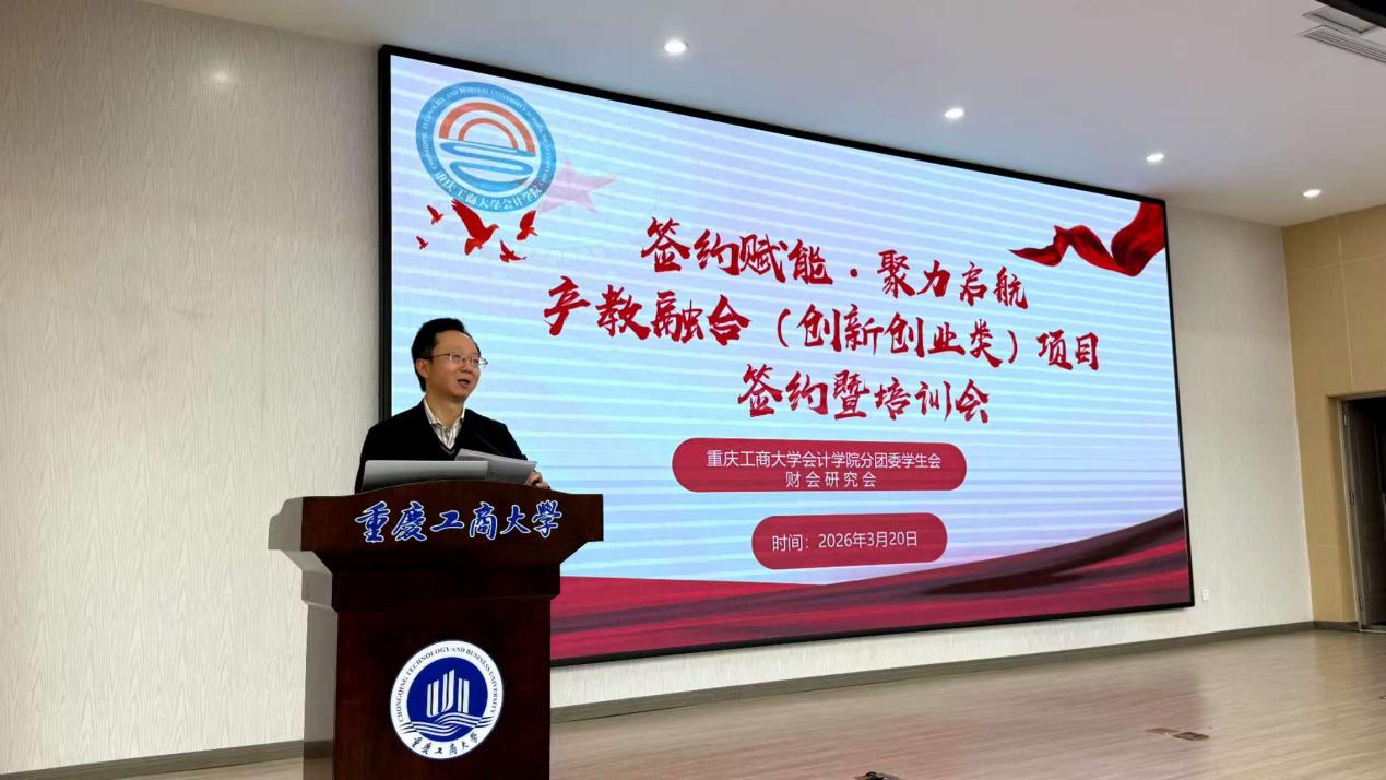 为积极深化产教融合,进一步提升广大同学的创新创业意识与实践能力,2026年3月20日,会计学院在明德楼1019举行产教融合(创新创业类)项目签约仪式暨培训会。学院党委副书记、纪委书记郝颖,会计学院学科建设办公室主任、重庆市政府绩效评价研究中心副主任杨兴龙,会计学院辅导员郑志欣,十支重点项目的团队成员及代表参加。