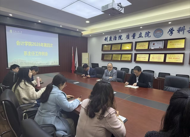 2026年3月26日,会计学院2026年第四次系主任工作例会在明德楼2019会议室顺利召开。学院党委书记邓德敏、院长钟廷勇、副院长梅波,各系主任及行政、教务部门相关人员参会。
