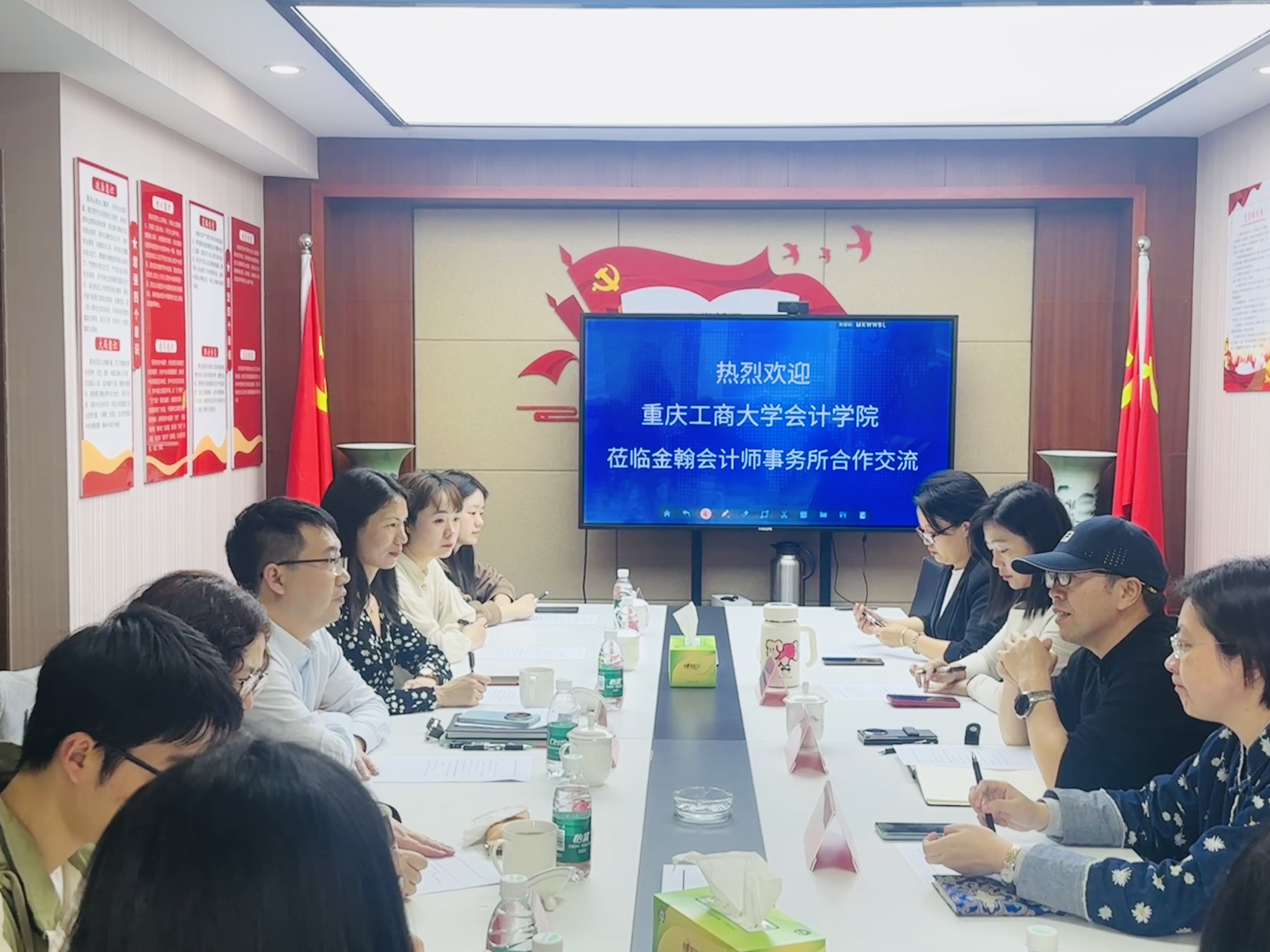 金翰会计师事务所所长李方全及各部门负责人,会计学院副院长蒋水全、合作与交流中心主任杜迎新、审计系副主任袁利华、会计学院专业硕士教育中心学位秘书刘念和会计学院学生办公室吴金珂五位教师出席会议,三名研究生代表参会,会议围绕研究生教育合作事宜深入交流。