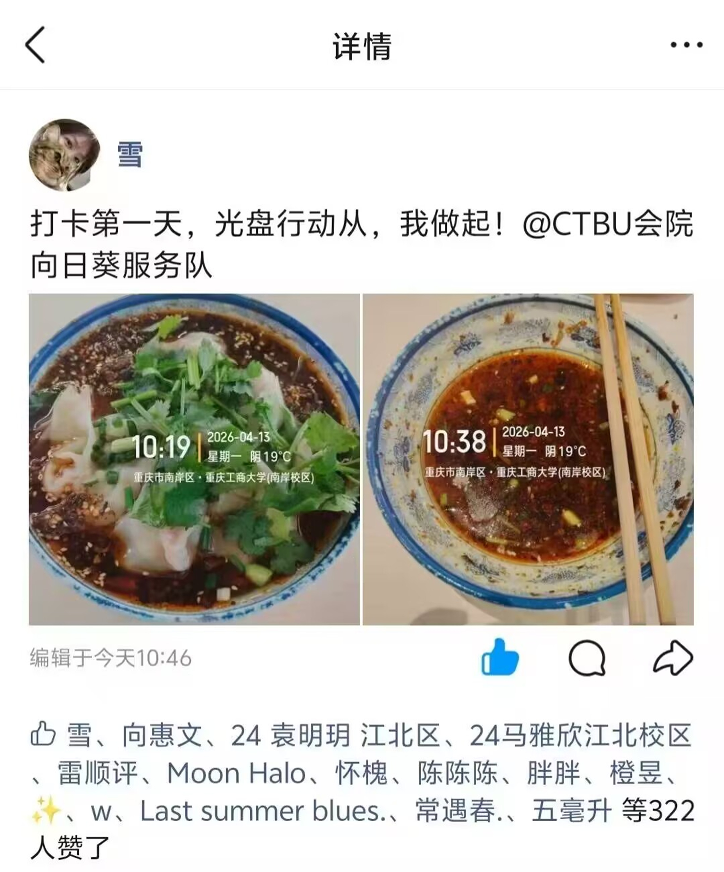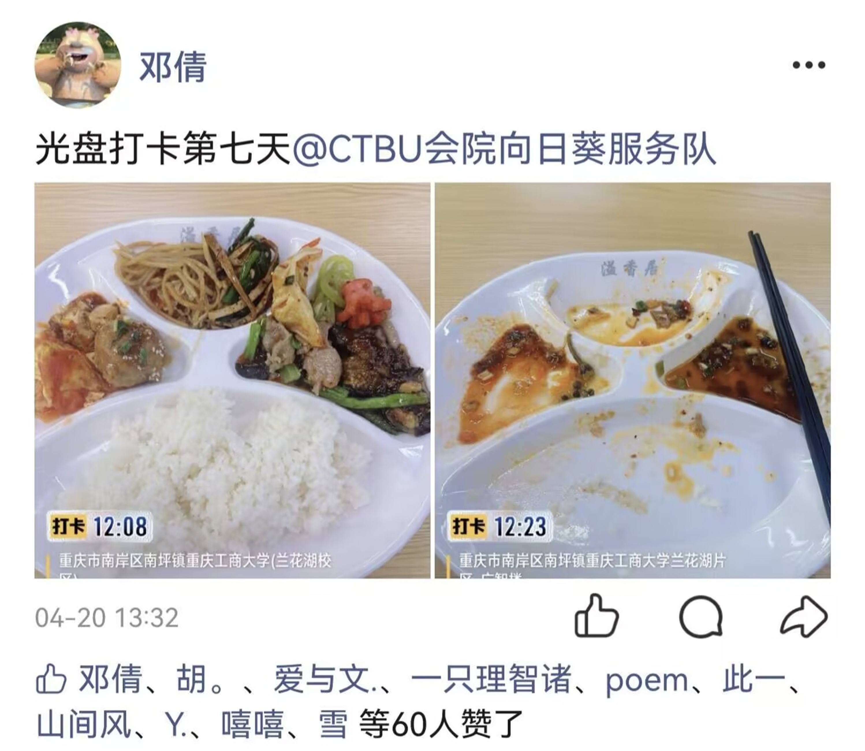为响应国家“厉行节约、反对浪费”的号召,传承勤俭节约的传统美德,引导青年学子树立正确饮食消费观,营造文明用餐、惜粮护粮的校园氛围,重庆工商大学会计学院向日葵青年志愿者服务队于2026年4月13日至4月24日,在线上顺利开展“青春惜食躬行处,校园崇俭践行时”光盘打卡行动。此次活动面向全校学生,以线上打卡为主要形式,将崇俭惜食理念转化为学子日常行动,为建设绿色节约型校园注入青春力量。