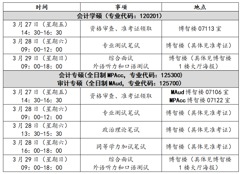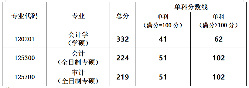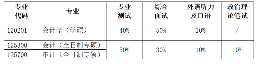 2.会计硕士(全日制专硕)、审计硕士(全日制专硕):入学考试总成绩实行百分制,按照初试成绩占60%、复试成绩占40%的权重计算。