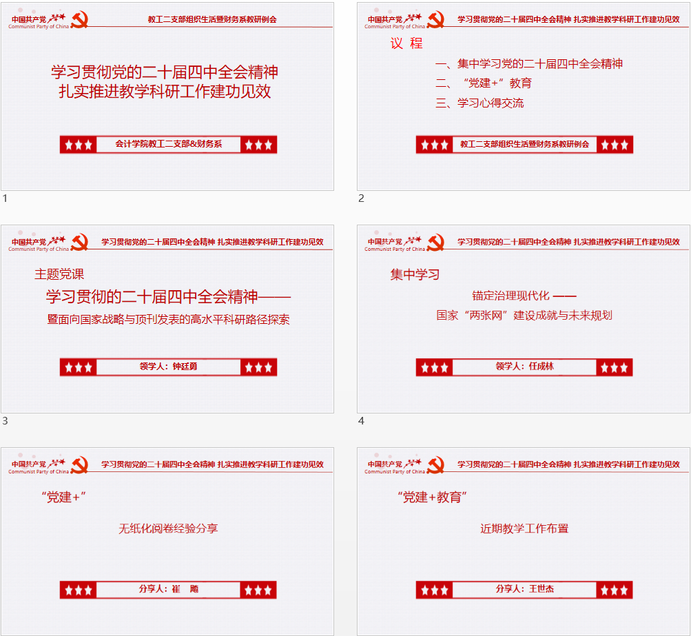 为深入学习贯彻党的二十届四中全会精神,将会议精神、战略部署转化为推动财务系教学科研高质量发展的强大动力,10月30日,重庆工商大学会计学院教工二支部组织生活暨财务系教研例会顺利召开。会议以“学思践悟全会精神,建功立业教育一线”为主题,通过政策领学、经验分享、专题研讨相结合的形式,推动理论学习与教学科研实践深度融合,全体支部党员及财务系教师参加会议。会议由二支部组织委员任成林主持。