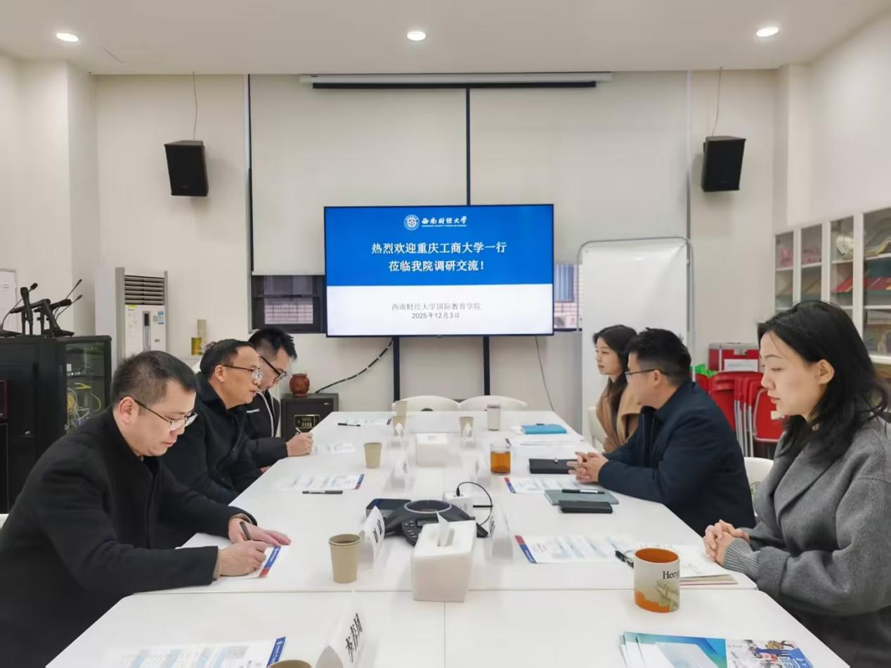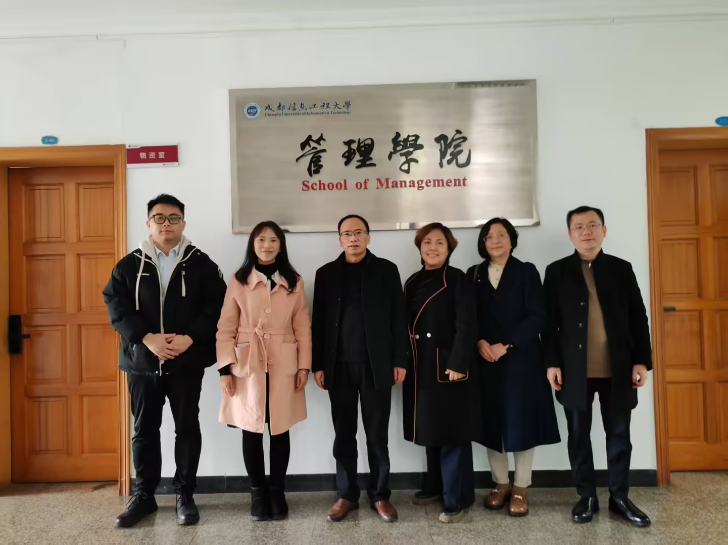 2025年12月2日至3日,重庆工商大学会计学院正处级专职组织员尹建平、工会主席刘斌、工会委员杜迎新、任成林一行,赴成都信息工程大学管理学院、西南财经大学国际教育学院调研工会工作,重点交流学习党建引领机制与工会特色实践经验。成都信息工程大学管理学院党委副书记刘宇、工会主席陈祖伟、西南财经大学国际教育学院院长袁松阳、招生办公室主任金璐儿、综合行政办干事庄典参与座谈交流。